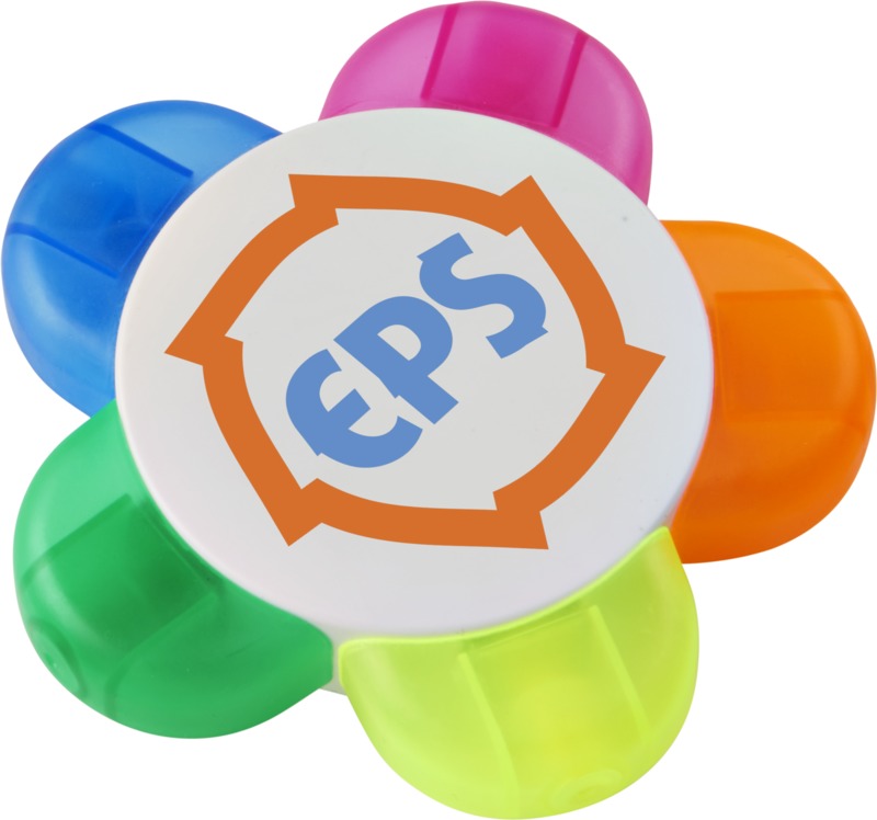 Flower shaped highlighter with five coloured highlighters in orange, pink, blue, green and yellow. Warning! Not suitable for children under three years. Small parts. Choking hazard. ABS Plastic.